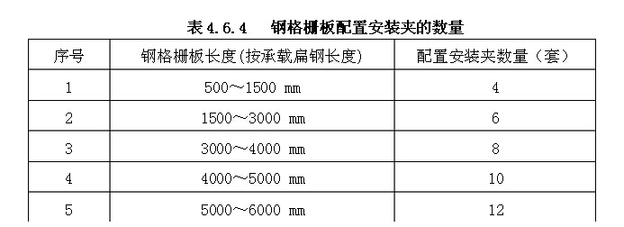 4.6.4 對于有拆卸要求的鋼格柵板一般采用安裝夾安裝。按照圖紙或廠家技術(shù)文件要求,將鋼格柵板用安裝夾緊固在支承粱上,原則上每塊鋼格柵板的安裝(約1平方米計)不少于四套安裝夾,分別安裝在鋼格柵板的四個角上。但如果鋼格柵板較長,且板中間有支承梁的情況下,安裝夾可按表4.6.4鋼格柵板配置安裝夾的數(shù)量配置