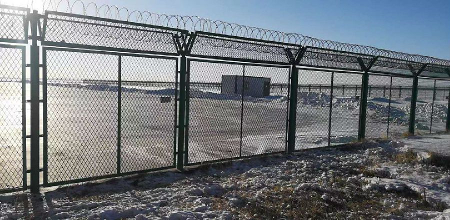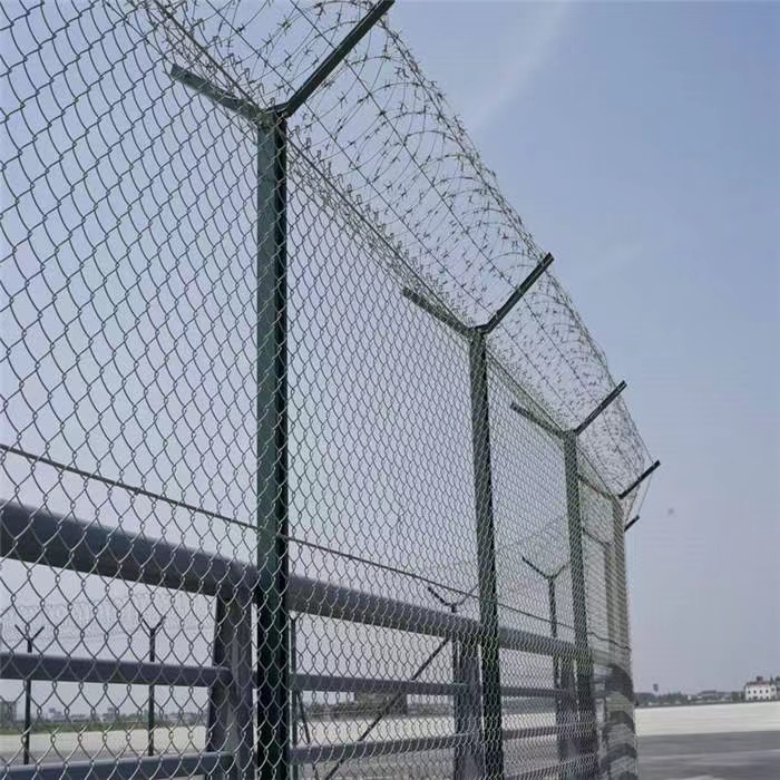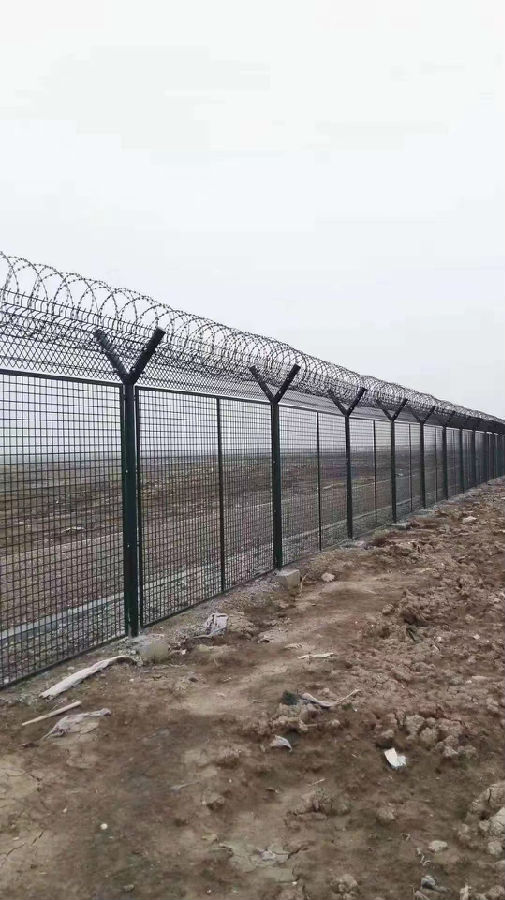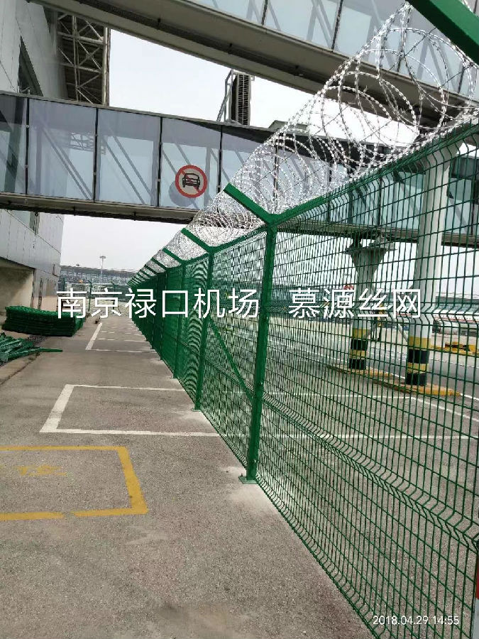 機場鋼筋網圍界是用于機場周邊防護,防止人和動物私自進入,它是由立柱、網片、刀刺滾籠等組成,表面處理一般為浸塑或噴塑,來延長使用壽命。